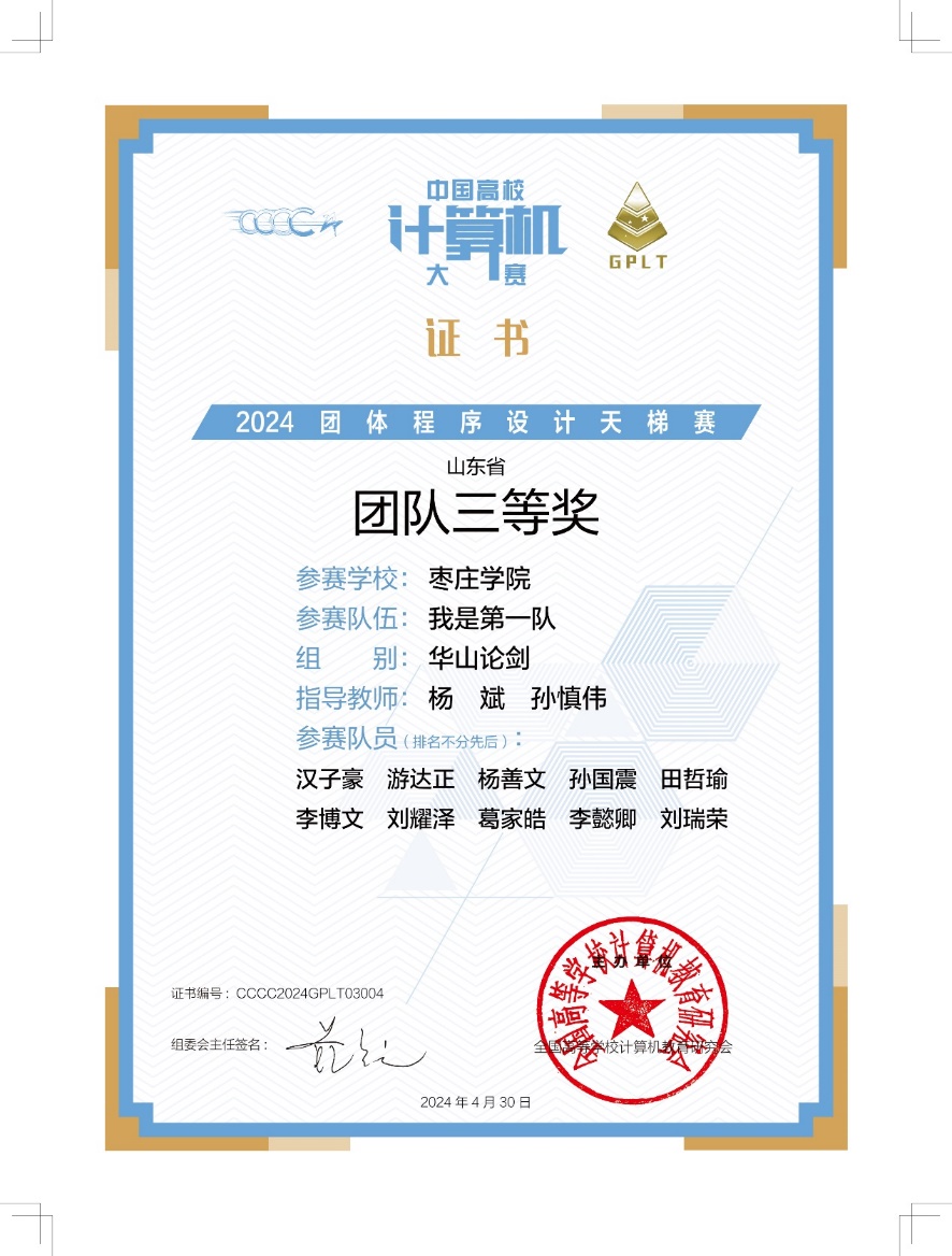 近日,第九届“中国高校计算机大赛-团体程序设计天梯赛”获奖名单正式发布,ladbrokes立博“我是第一队”参赛代表队在本次竞赛中喜获“华山论剑”组山东省团队三等奖。