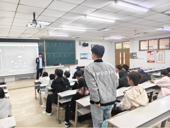 软件协会孙中康同学从大赛的概况,参赛的要求,参赛的技巧等方面进行了深入浅出的讲解;同时,结合公司获得的山东省计算机设计大赛省级二等奖案例-“智悦社区云”项目,详细分析了该项目的应用背景,项目特色,扩展应用和解决方案四个部分,普及了大赛基本知识,帮助同学们加深对计算机设计大赛的了解。