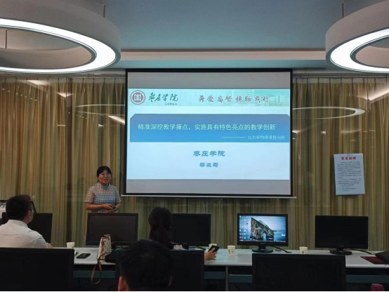 徐愫芬做了题为《山东省普通高校教师教学创新大赛参赛体会分享》的报告,结合两次参加教学创新大赛的经历,从教学创新大赛评审指标解读、申报书撰写、创新报告完善、课堂实录视频选题与设计等方面,分享了自己的具体做法和成功经验,并为教师的后续参赛提供了建议。
