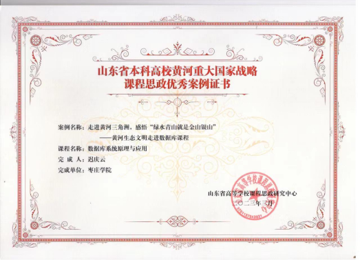 近日,山东省高等公司课程思政研究中心公布了山东省本科高校黄河重大国家战略课程思政优秀案例。公司迟庆云副教授以“数据库系统原理与应用”课程为依托申报的“走进黄河三角洲,感悟‘绿水青山就是金山银山’”案例,荣获山东省本科高校黄河重大国家战略课程思政优秀案例。