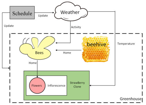 草莓在全世界范围内具有广袤的种植面积,经济价值巨大。因其生殖生长过程依赖虫媒传粉,蜜蜂等典型授粉昆虫一方面可以显著提高坐果率,增加产量,降低畸形果率,但另一方面,传粉昆虫也能够通过传播灰霉病造成大量的果实坏死,降低产量。在温室环境中,虽然微气候环境可控,但是传粉昆虫的行为、草莓种植的空间模式,已表明对传粉效率造成影响,但影响的因素及其量化指标尚不明确。课题组通过与相关科研院所合作,利用专家知识构建了模拟仿真模型,深入研究了蜜蜂密度和蜂巢分布对授粉效率的影响。该模型能够模拟不同条件下的蜜蜂授粉效率,详细地跟踪每一个蜜蜂、花朵、花粉和果实的状态,并在不同的尺度下进行可视化展示。课题组发现,受饱和效应影响,当蜜蜂密度高于1只蜜蜂/株时,草莓果实品质难以再提高,且离散分布的蜂箱可以显著提高果实品质。此外模拟结果还表明,持续的蜜蜂授粉过程可以显著降低柱头接受性和花粉相容性对果实品质的影响,课题组认为这种效应以及花粉在柱头的均匀分布是草莓蜜蜂授粉优于人工授粉的两大原因。