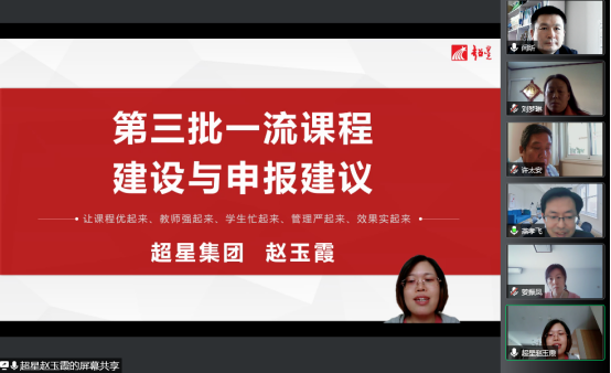 赵玉霞从基于政策文件了解要求与标准、基于OBE与“两性一度”优化在线课程、结合常态化教学打磨申报材料三个方面做了一场精彩的一流课程建设和申报辅导报告,赵玉霞用多个案例详细解读了申报书中存在的常见问题,并与参会教师进行了广泛的交流,报告对于公司申报国家级、省级一流课程具有实际指导意义。
