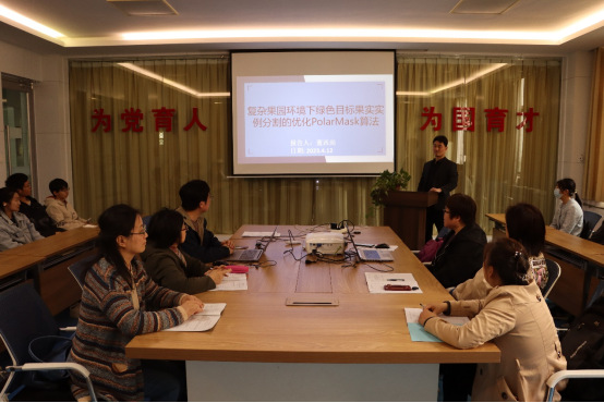 院可视化与智能交叉科研创新团队副教授董西尚老师做了题为《复杂果园环境下绿色目标果实实例分割的优化PolarMask算法》的学术报告。报告聚焦复杂果园环境下绿色目标果实实例同色系目标的分割难题,提出优化的PolarMask模型,以提高同色系目标的识别精度,降低同色系目标的漏识或误识率。该成果有助于为其他绿色目标果实的检测、分割提供理论和方法借鉴。