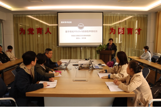 院可视化与智能交叉科研创新团队讲师刘巧莲老师做了题为《基于优化YOLOv5的绿色苹果检测》的学术报告。报告将深度学习在机器视觉领域的最新进展与农业生产活动相结合,针对绿色苹果检测中识别精度易受背景杂色、相近果色、枝叶遮挡和果实重叠等干扰因素影响的难题,提出基于YOLOv5的优化模型,并构建绿色果实数据集进行实验验证,结果表明优化的检测模型提升了近色背景下对绿色果实的检测性能。研究成果有利于促进早期果园测产和自动采摘等后续工作,对提升智能农业设备的发展有重要意义。