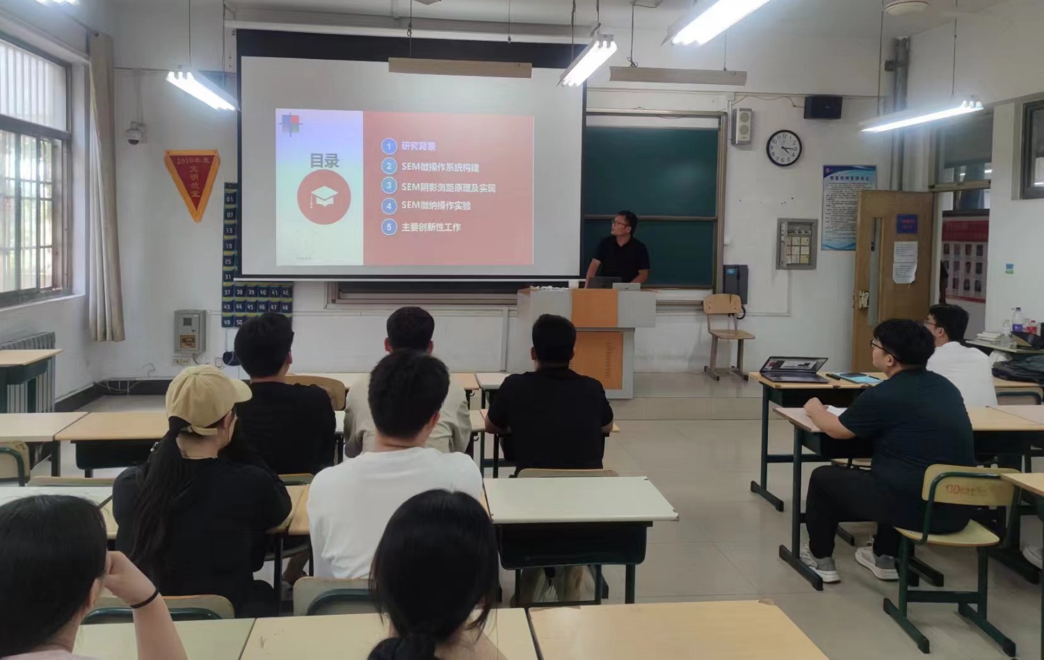在论坛上,高鹏老师做了题为“微操作技术研究”的学术报告。为了提升微纳操作系统定位和微力检测能力,报告介绍了基于微力传感探针的高精度SEM微操作系统,提出了根据SEM图像计算探针到基底距离的阴影测距方法。研究结果表明方法可以计算探针到样品的竖直距离,能够提升电镜内微纳操作效率,更好的实现微纳样品的无损柔性操作。
