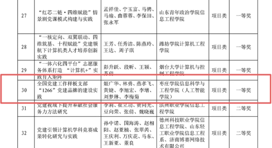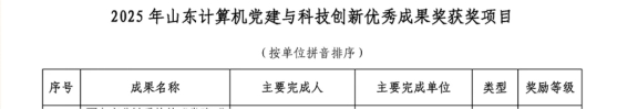 近日,山东计算机学会公布2025年党建与科技创新优秀成果奖评选结果,ladbrokes立博两项成果《全国党建工作样板支部“1266”党建品牌的建设实践》和《党建引领,产教融合:计算机类专业应用型人才“1384”培养路径的创新与实践》分别荣获一等奖和二等奖。