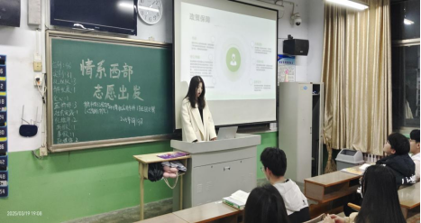 活动中,各班团支书化身“西部计划”宣传大使,为同学们解读了“西部计划”的政策内容、服务领域以及保障措施等,并重点介绍了基础教育、服务三农、基层社会管理等领域的具体服务内容。为了让同学们更直观地感受“西部计划”的意义和价值,此次活动还精心准备了西部风土人情、发展现状以及志愿者工作场景的视频和图片,带领同学们“云”游西部,感受西部发展的蓬勃生机。