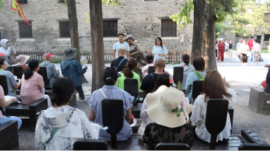 随后,实践团走进台儿庄古城,在大战故事馆中,锈迹斑斑的武器仿佛还带着当年的硝烟,将80年前那场关乎民族存亡的生死搏杀鲜活地呈现在眼前。在遗址公园的弹痕墙下,实践团成员结合所学所思,主动向过往游客特别是青少年分享他们视角下的台儿庄大战故事,阐释抗战胜利的伟大意义与深远影响,强调这是中国人民用鲜血和生命换来的胜利。通过青年视角传递对历史的敬畏和对先烈的缅怀,深化对抗战精神时代价值的理解。