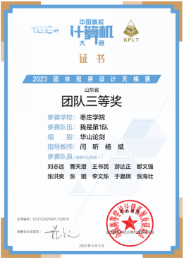 2023年5月,公司学子“我是第1队”参赛代表队在第八届“中国高校计算机大赛-团体程序设计天梯赛”中喜获“华山论剑”组山东省团队三等奖。