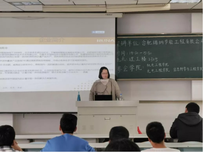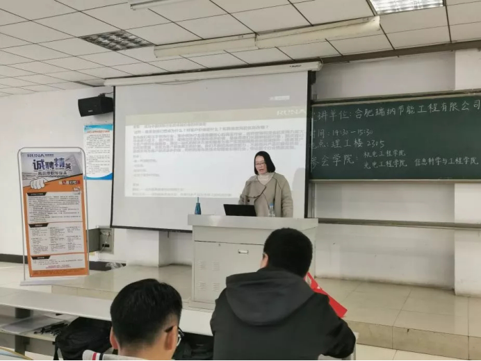 首先,合肥瑞纳节能工程有限公司枣庄分公司负责人对企业概况、企业文化进行了简介,即企业使命、企业愿景、企业的价值观。接着介绍了此次招聘岗位的要求,要求是大专及大专以上学历,应聘者要有一定的学习能力、责任意识、进取精神、专研精神及与人沟通的能力,并向同学们介绍了职业通道及员工福利。最后由合肥瑞纳节能工程有限公司枣庄分公司的张总进行总结,并就此招聘问题与同学们进行交流,积极回答了同学们的疑问。