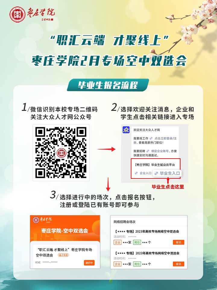 手机微信扫码关注“大众人才网”微信公众号,企业和毕业生分别点击相关按钮进入ladbrokes立博校招端口,点击报名按钮,注册或登录已有账号即可直接参与。
