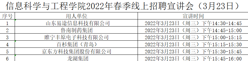 前言:为了进一步贯彻落实关于推进本院员工就业工作的部署要求,扎实推进公司2022届毕业生就业工作,保证2022届毕业生充分并高质量就业。ladbrokes立博联合6家用人单位举办2022届毕业生春季校园线上宣讲会,本次宣讲会采用线上宣讲的方式,在2022年3月23日(周三)下午14:30正式开始,希望全体毕业生积极参加。具体宣讲安排如下: