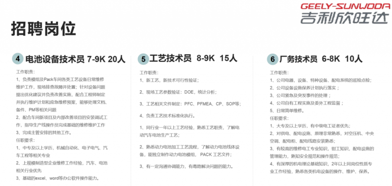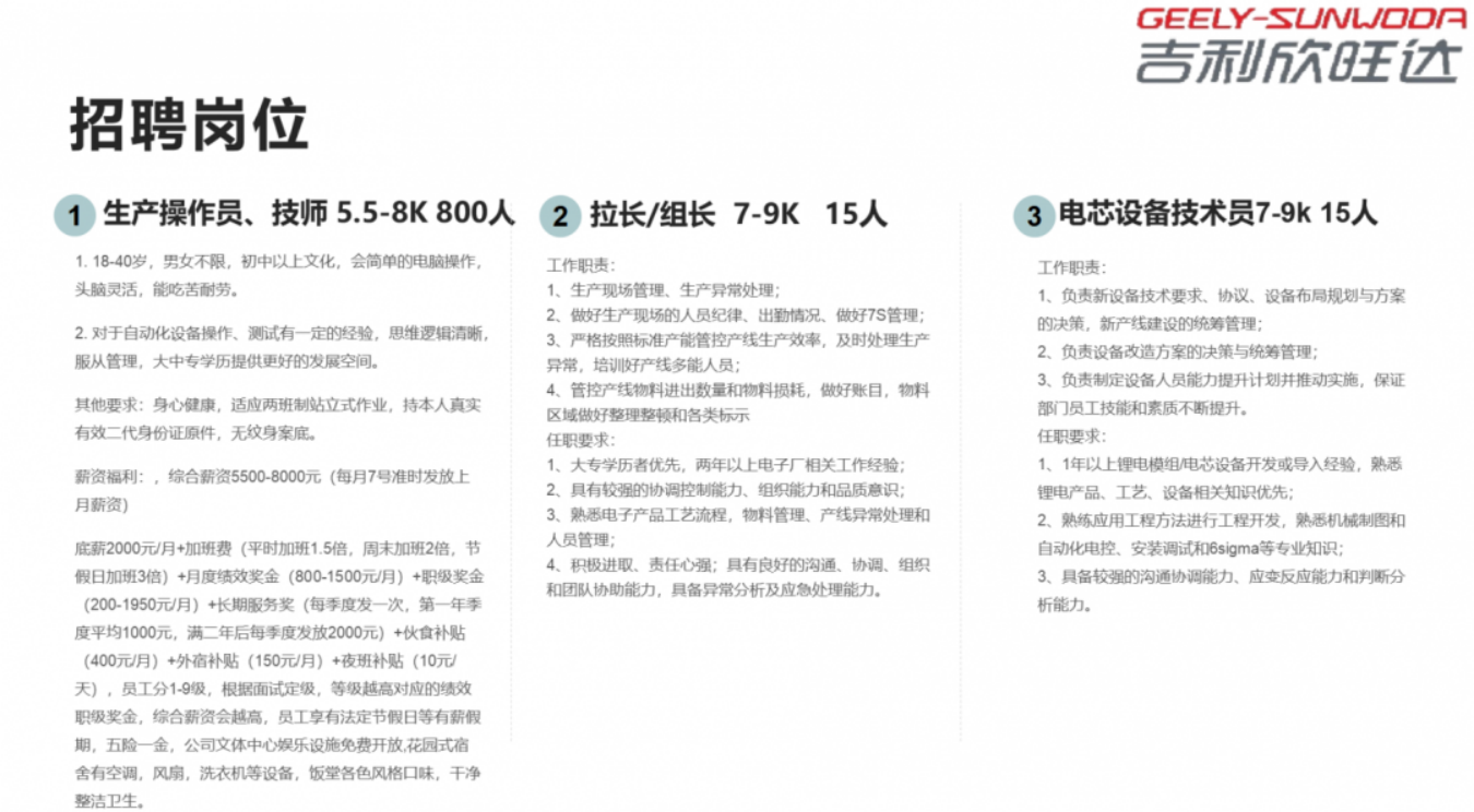 吉利欣旺达动力电池有限公司主要从事动力电池电芯(BEV/HEV)、电池模组和电池系统的研发、生产、检测、销售、运营等经营活动。公司占地面积约451亩,总投资50亿元,达产后预计年产电芯4.5GWH。可实现年销售收入50亿元、利税5亿元,可吸纳就业2000余人。