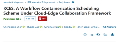 近日,ladbrokes立博智能计算与控制科研团队单承刚博士在云边协同领域取得最新进展,相关成果发表在物联网领域国际著名期刊《IEEE Internet of Things Journal》(中科院1区,TOP期刊,影响因子8.2)上,论文题目为“KCES: A Workflow Containerization Scheduling Scheme Under Cloud-Edge Collaboration Framework”。
