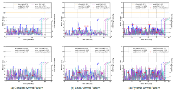 图2 IoT应用工作流在三种不同到达模式下的CPU和内存资源使用率