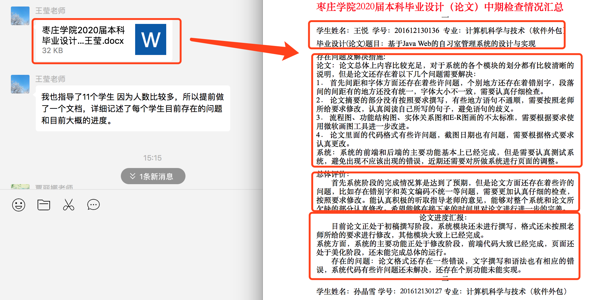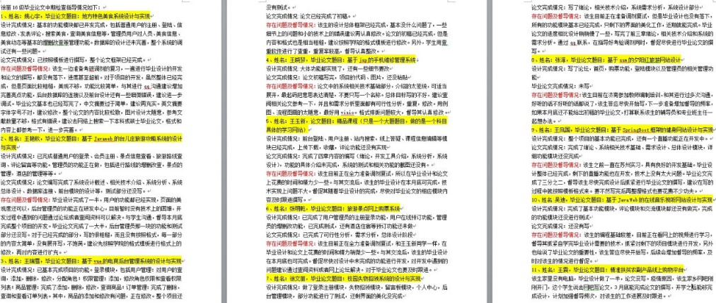 目前我所指导的11位同学基本都已完成论文初稿,由于系统未完全成型,所以论文的部分章节未完成,论文格式还存在一些错误,文字撰写和语法也有相应的错误,系统代码有些许问题还未解决,还存在个别功能未能实现。