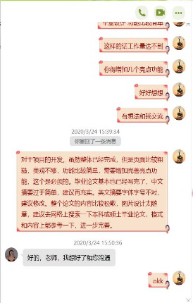 建立毕业论文指导QQ群,在群里发布具体时间点信息,督导员工在规定的时间内提交计划完成的工作并逐一检查。此外,还指导员工采用录屏的形式提交自己所做的毕业设计情况,确定员工们的实际开发进度。结合同学们在家的不同实际情况,对论文初稿完成时间征求意见,对员工反馈的困难积极协助解决。
