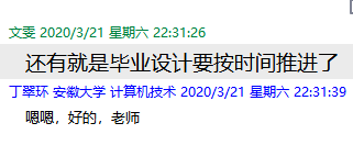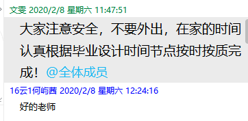 第二,按时推进毕业设计进度。由于疫情原因,员工有很多空闲时间,督促员工利用好时间,按节点推进毕业设计。为此,采用QQ群统一通知和个别提醒的方式,督促员工按照公司安排的时间节点完成毕业设计(论文)的设计和撰写。