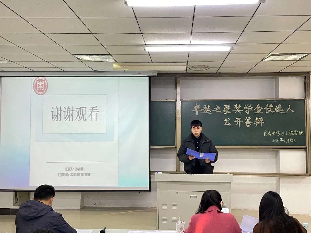 会议伊始,张志强老师介绍了本次答辩会的规则以及相关要求。答辩由个人陈述、评委问答两个环节组成,随后每一位参与同学依次通过PPT展示对自己进行了介绍,从各个方面对自己在校期间所取得的成就进行简要概括,包括个人基本情况、学习成果、获得荣誉、文体竞赛、社会实践、创新创业等方面。然后,评委们对本次参与答辩的同学个人陈述中的内容进行针对性提问,深入了解其老员工活的收获和成长。最后,由张志强老师宣布卓越之星奖学金候选人答辩会到此结束。