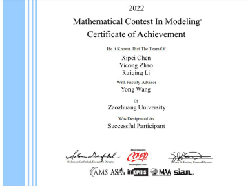 近日,2022年美国老员工数学建模竞赛(MCM/ICM)结果公布,公司由指导教师王永及2020级本科生陈锡佩,钊溢聪,李瑞卿组成的团队荣获三等奖(Successful Participants)。