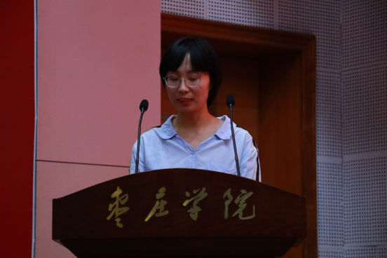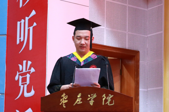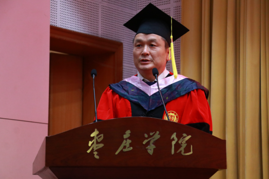 毕业生代表孙子恒作为优秀毕业生代表发言,回顾了在枣院学习生活的点点滴滴,并代表公司毕业生郑重承诺:要谨遵校训,感恩母校,回报社会。2019级在校生代表省优秀员工干部、院员工会主席田昊宇作为在校生代表发言,表示将以学长为榜样,不负韶华,勇毅前行。教师代表陈文平为全体毕业生送上最衷心的祝福与期盼。
