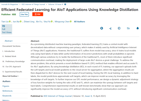 ladbrokes立博联邦强化学习科研创新团队设计了一种利用知识蒸馏为人工智能物联网提供高效联邦学习的算法,有效提升数据异构场景下联邦学习模型训练效率。研究成果以“Efficient Federated Learning for AIoT Applications Using Knowledge Distillation”为题发表在SCI一区TOP期刊IEEE Internet of Things Journal,影响因子10.238。