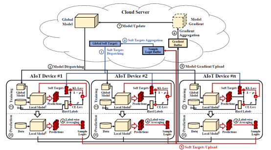 为解决数据异构场景带来的“客户漂移”问题,提升复杂异构物联网场景下联邦学习模型的推理精度,课题组提出基于蒸馏的联邦学习算法,将知识蒸馏的概念引入到联邦学习中。在每轮模型训练时,将传统联邦学习与知识蒸馏相结合,在云端服务器和终端设备中同时传输软、硬标签用以模型训练,从而有效提升联邦学习训练效率。在此过程中辅以损失函数的动态调整策略,可以最大化的协调软、硬标签在训练各时段的贡献比例。在多种著名数据集上的综合实验结果表明,该方法能够在不引入大量通信开销的情况下,有效的提升联邦学习模型推理精度。