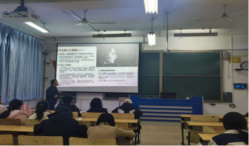 在学术讲座上,单法动老师紧紧围绕人工智能的发展与原理展开讲解。单老师首先介绍了人工智能的发展历史,阐释人工智能的概念与类型。随后,单老师以深度学习与智能围棋为例,深度讲解了人工智能的基本原理与学习方式,并进一步探讨人工智能目前遇到的问题与技术发展方向。同学们与老师积极互动,认真学习,现场有浓厚的学术氛围。